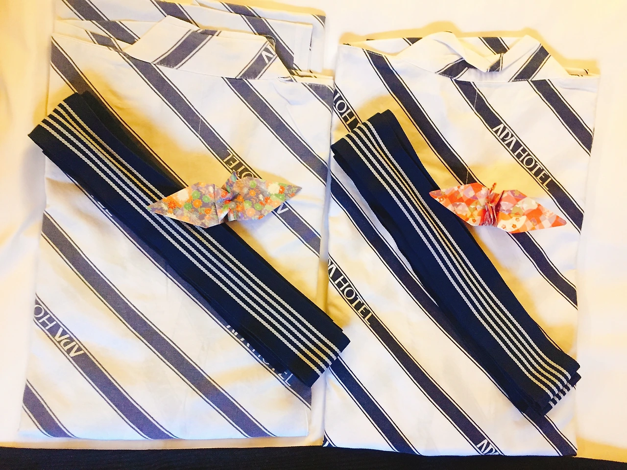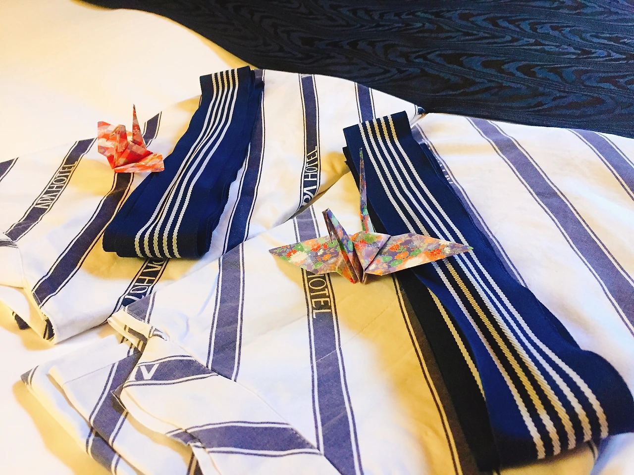 예쁜 종이학이 올려져 있는 유카타가 침대 위에 고이 접혀 있다.