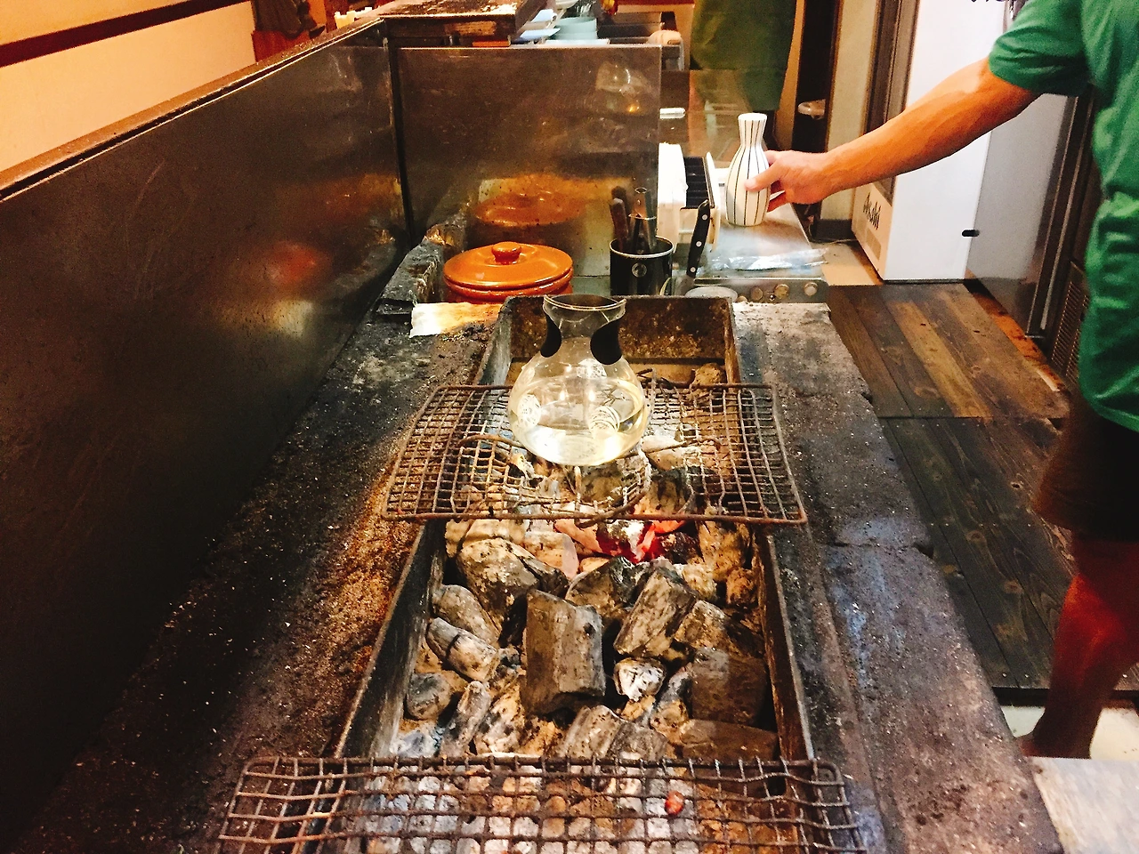 사케를 실험관 같은 주전자에 넣어 숯불에 데워주신다.
