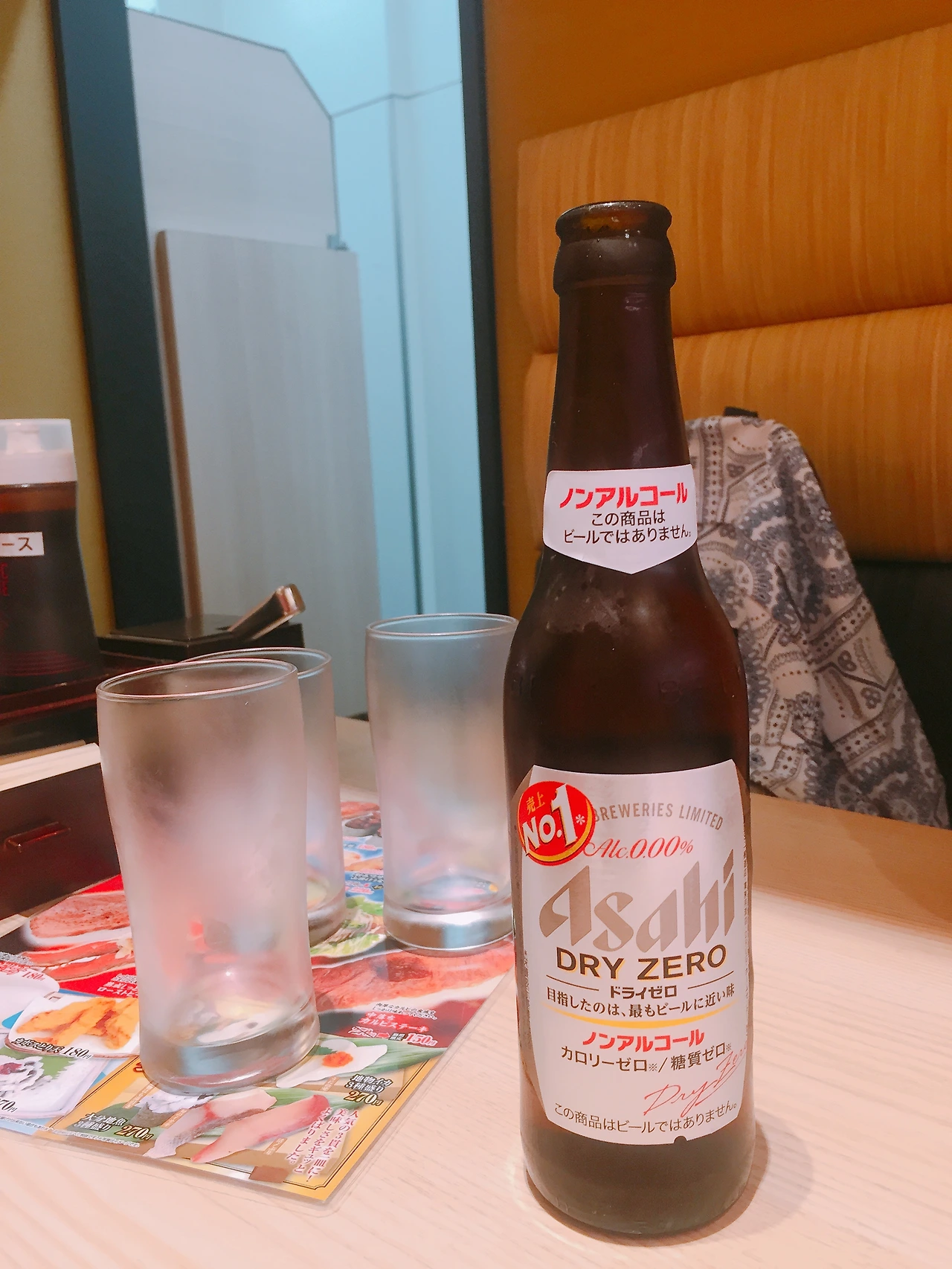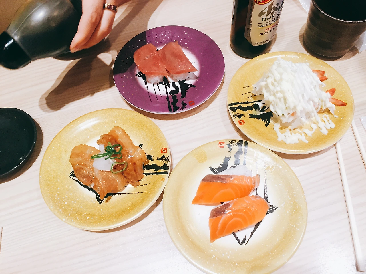 앉아서 벽에 붙어있는 태블릿 메뉴판으로 주문을 하면 갖다주기도 하고 기차가 오기도 하고 먹는 재미가 있는 곳이었다. 메뉴판이 일어라서 느낌 가는대로 눌렀다가 주문을 안 누르고 취소를 누르고 한참을 기다리는 실수도 하고 맥주를 시킨다더니 말도 안되게 논알콜 맥주를 주문하기도 했다.