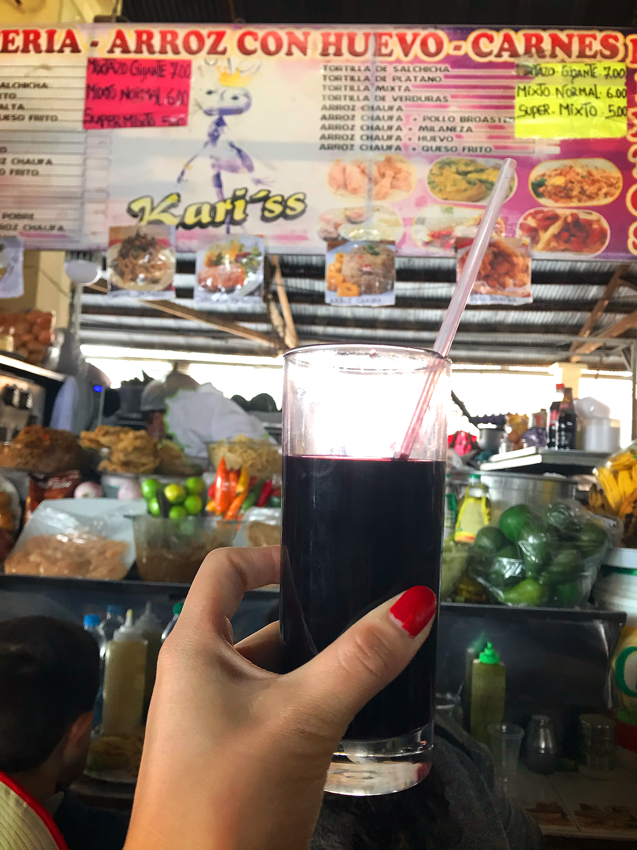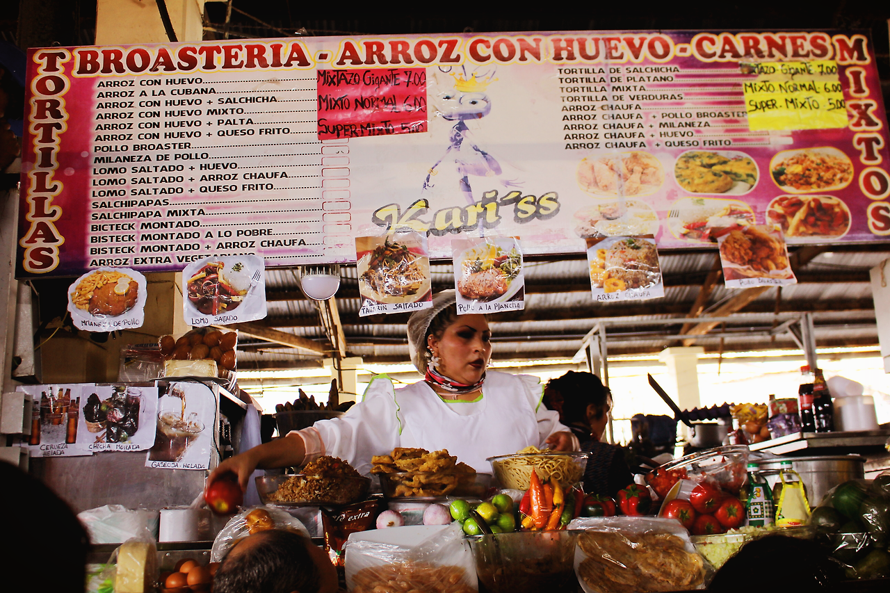 시장의 뒷 쪽으로 돌아가면, 우리나라의 포장마차 골목을 연상케 하는 먹거리 상점이 줄지어 있다. 페루의 대표 음식인 소고기 볶음(로모 살타도 Lomo saltado), 날 생선 샐러드(세비체 Ceviche)부터 페루식 닭 국수(깔도 데 갈리아나 Caldo de galliana), 샌드위치, 남미 과일을 이용한 과일주스 등 까지 시장에서 찾아볼 수 있는 음식의 종류는 매우 광범위하다. 간혹 우리나라 장터에서 엿가락을 치던 엿장수와 같이 이 곳 장터에서도 페루 음악을 틀고 묘기를 부리거나 춤을 추는 춤꾼의 모습도 심심찮게 구경할 수 있다.