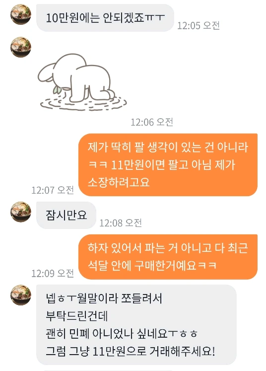 그랬더니, 그녀가 5천 원을 깎아서 11만 원이 된 걸 1만 원 더 깎아서 10만 원에 안 되겠느냐고 물었다.