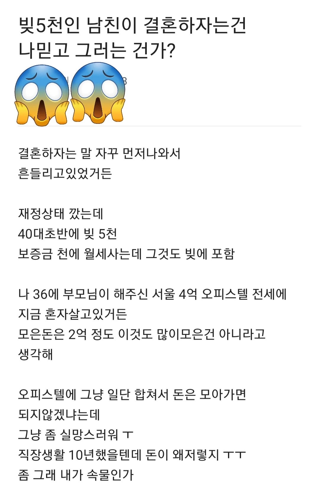 그런 경우라면 절대 결혼을 고려하면 안 된다는 의견부터 결혼의 무게를 고려하지 못한 섣부른 발언이다, 또