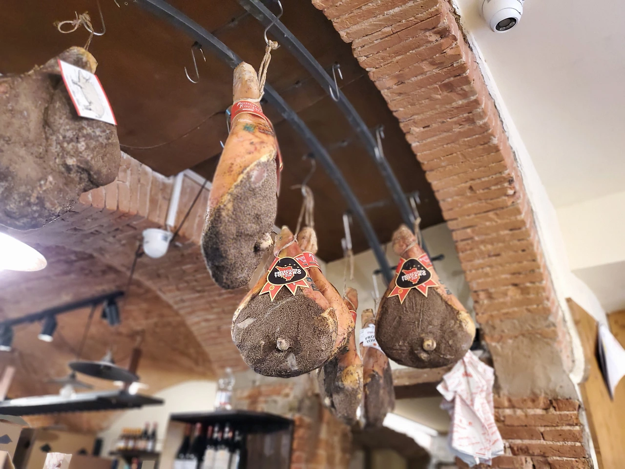 천장에 주렁주렁 달린 프로슈토와 하몽에 한 번,