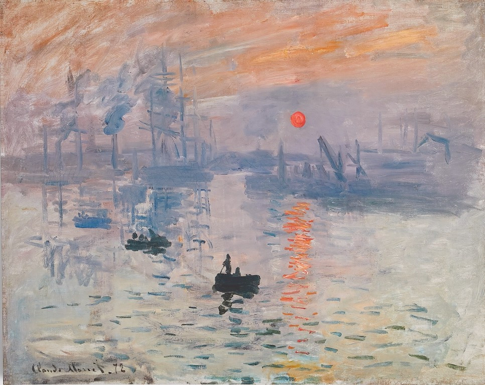 모네가 묘사한 <해돋이>는 붉고 푸르다. 또렷하게 떠오른 태양과 바다의 색이 대조를 이룬다. 그림의 가운데에는 노를 저어 가는 배 한 척이 눈에 띈다. 해가 뜨는 아침에 바다로 조업하러 나가는 풍경이 단순하면서도 활기차 보인다.