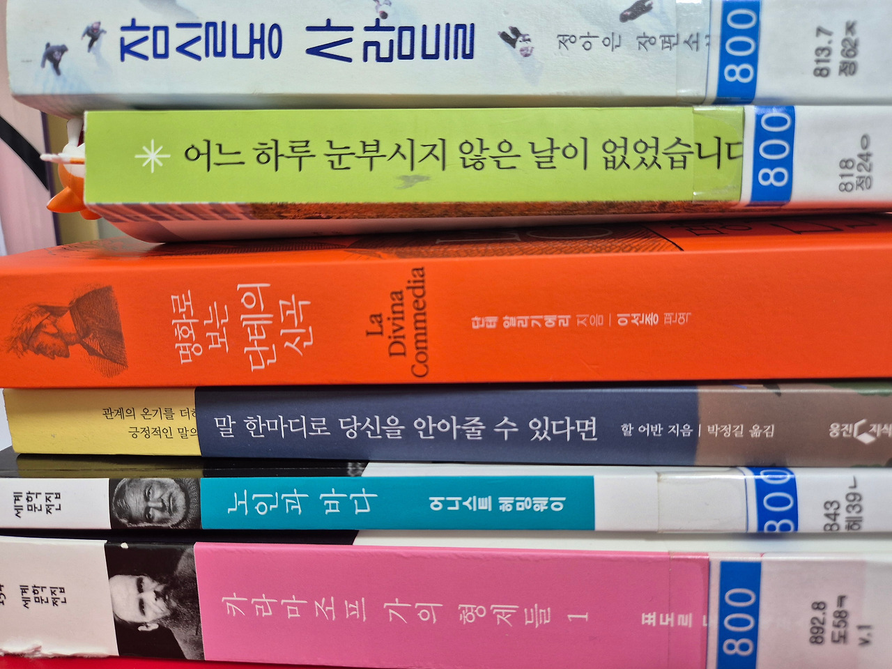 혼자 책 읽기를 하면 분명 중간에 포기할 나라는 걸 알기에 장치를 마련했다. 고명환 작가님의 ‘고전이 답했다’를 읽으며 고전의 매력에 발을 들여보고 싶었는데 마침 함께 읽을 수 있는 모임이 있어 함께 참여하기로 한 것이다. 나의 지적 수준으로 감히 고전을 이해하며 읽을 수 있을까도 싶었지만 읽는 데 의의를 두자는 소박한 목표로 시작했다. ‘변신’, ‘노인과 바다’를 거쳐 ‘카라마조프 가의 형제들’을 읽고 있는데 역시 순탄하지 만은 않다. 하지만 나의 목표는 완독이니 이해 안 되는 부분은 과감히 넘어가고 재미있는 부분은 즐기며 읽고 있다. 고전과 함께 이번 달 읽은 책은 명화로 보는 ‘단테의 신곡(1/2), 어느 하루 눈부시지 않은 날이 없었습니다. 결국 해내는 사람들의 원칙, 잠실동 사람들’ 총 7권이다. (단테의 신곡, 카라마조프 가의 형제들은 아직 완독 하지 않았지만 절반씩은 읽었으니 읽은 권수에 포함시켜도 되지 않을까)
