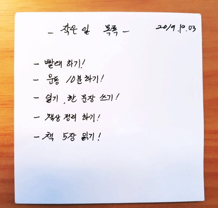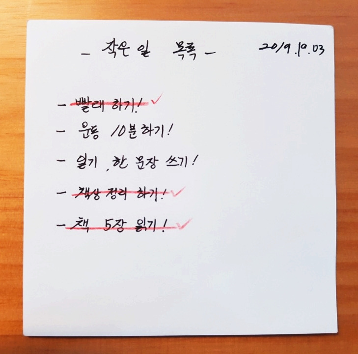 처음으로 해야 할 일은 작은 일 목록을 만드는 거예요. 밑에 제 손글씨로 작은 일 목록 예시를 써보았어요. 이러한 형식으로 자유롭게 그 날 해야 할 작은 일 목록을 작성해보는 거예요.