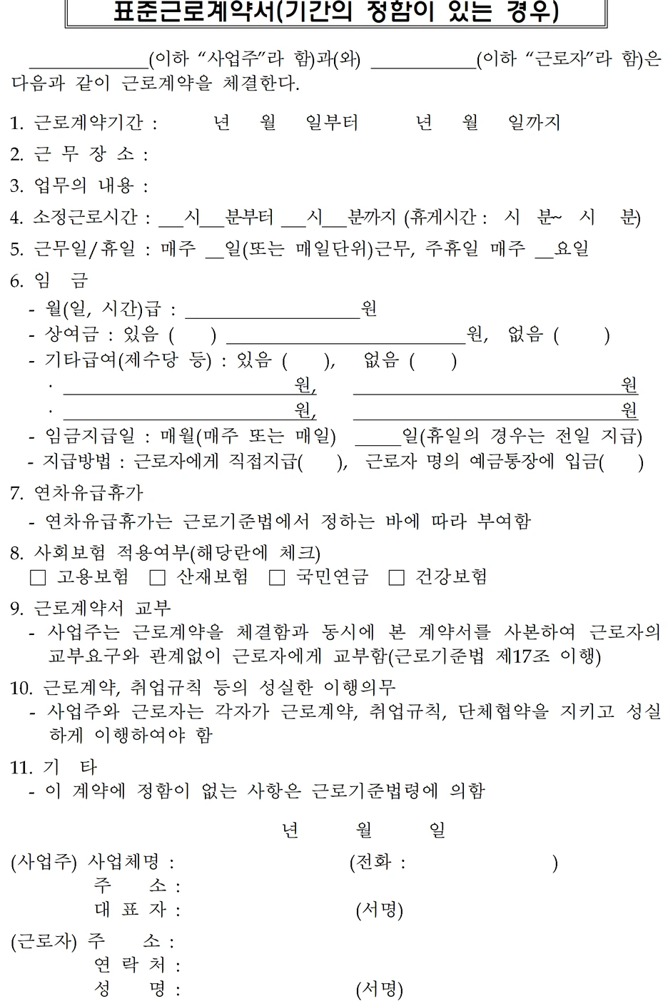 근로 계약 기간은 고용의 형태에 따라서 각각 다르게 기입할 수 있습니다. 아르바이트나 계약직은 기본적으로 기간제 근로자라고 봐야 합니다. 그래서 보통 언제부터 언제까지로 명확한 근로 기간을 적습니다. 반면에 정규직 근로자는 근로 시작 일은 표기하지만 종료 시점은 적지 않습니다. 그래서 위의 표준근로계약서는 계약직 또는 아르바이트에 해당합니다.