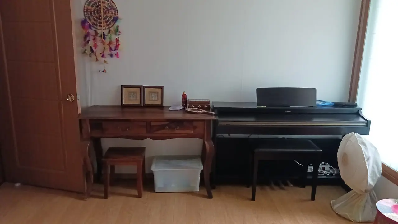 (사진: 한국 집의 안방. 피아노 옆의 가구와 액자, 드림캐쳐는 인도에서 사 온 것들이다. 통 나무로 만들어진 인도의 가구들은 참 예쁘다.)