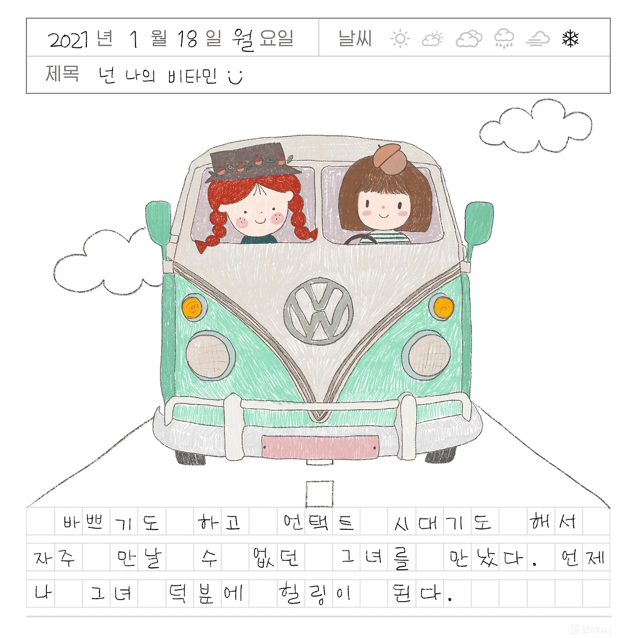 테이크 아웃한 커피를 그녀의 차 안에서 마시며 이야기를 나누었다. 함께 차에서 수다를 떨다 보니 그녀에게 가끔 농담 반 진담 반으로 어디론가 같이 여행을 가면 좋겠다고 말하곤 했던 것이 떠올라 일기를 그려보았다. 언젠가 코로나 따윈 걱정하지 않고 귀여운 캠핑카를 타고 떠나는 즐거운 상상. 언젠가는 실행할 수 있기를-