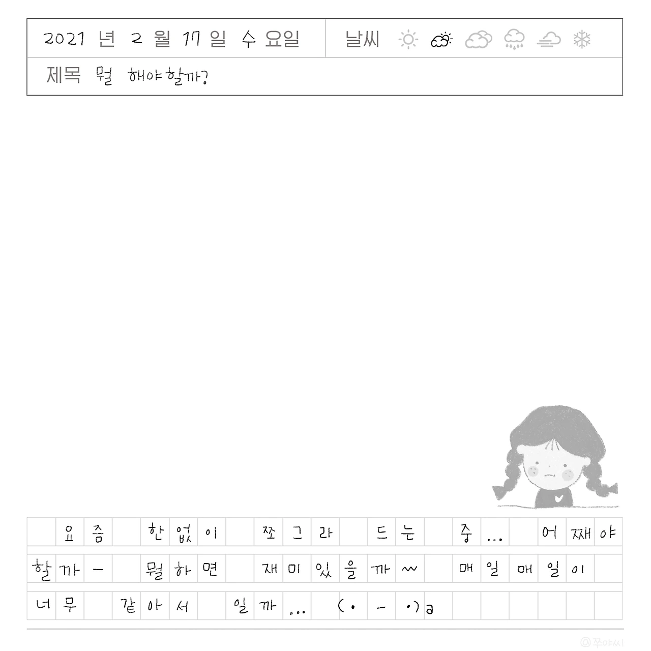 일기를 뭘 써야 할까도 모를 정도로 쭈글쭈글한 마음이었다.