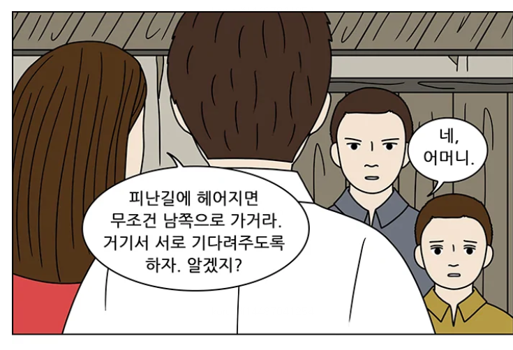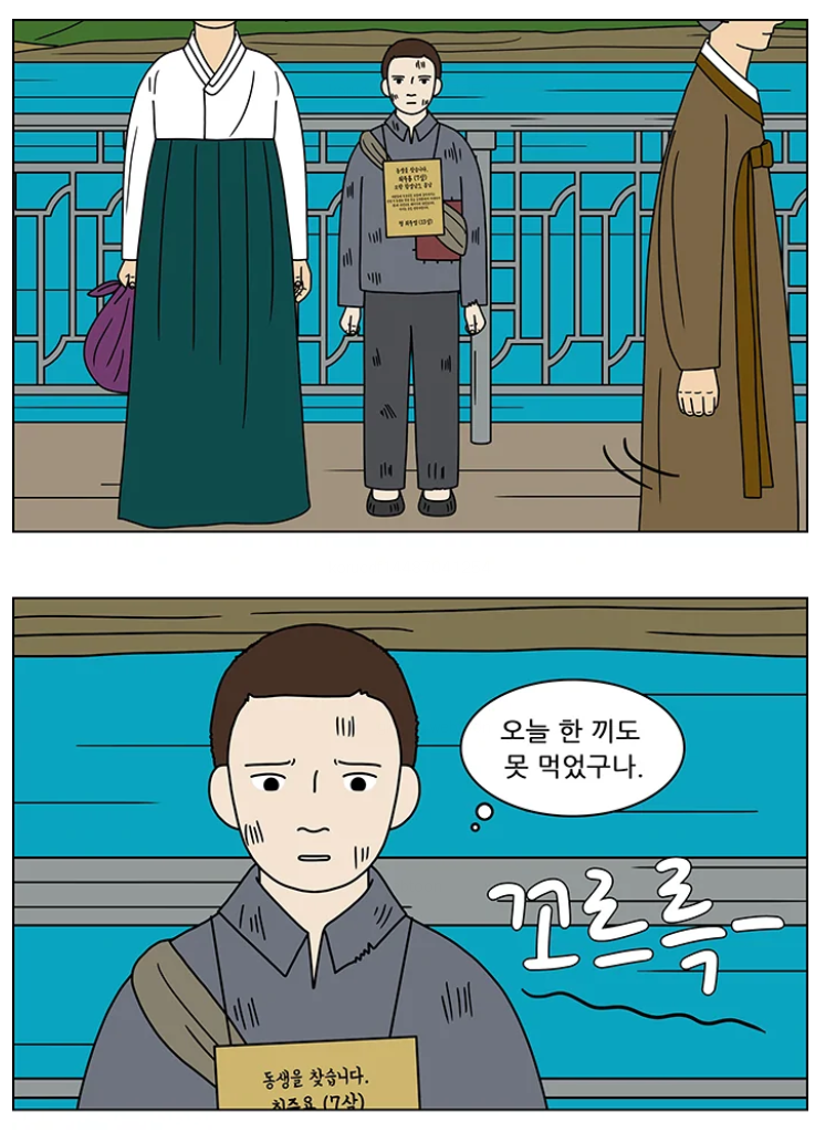 다행히 글을 아는 주인공은 스스로 팻말을 만들어 목에 걸고 사람들 틈에서 헤어진 동생을 하염없이 기다린다.