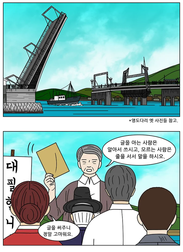 영도 다리의 유명한 도개 장면과 글을 모르는 피란민들을 위해 대필해 주는 장면.