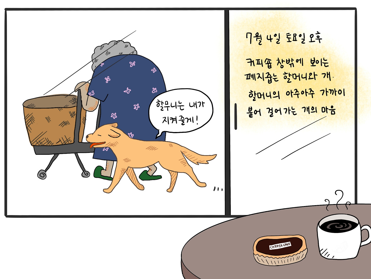 신산리에는 매일 마주칠 정도로 부지런한 폐지 줍는 할머니가 있다. 그리고 그 옆에는 꼭 달라붙어 다니는 개가 한 마리 있다. 부지런히 돌아다니는 것에 비해 할머니의 구르마는 비어있을 때가 더 많아 속상했는데 요즘엔 나라에서 지원하는 복지 일자리에 참여하는지 빈 구루마대신 노란 조끼를 입고 쓰레기를 줍는다. 여전히 꼬질꼬질한 개는 호위하듯 할머니 곁을 바싹 붙어 다녔다.