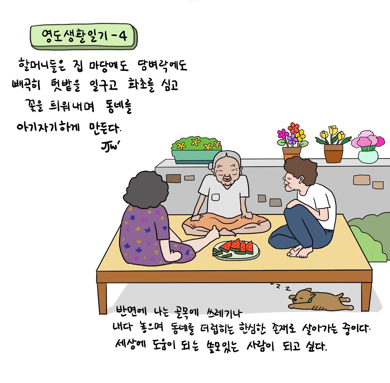 편의점 알바를 그만두고 새로 얻은 일은 재택근무였는데 일이 점점 바빠지며 동두천에 있는 본사에 가야 할 일이 종종 생겼다. 영도에서 동두천까지 왕복 900킬로이다. 몇 번 오가다 보니 늙은 개에겐 장거리 이동이 아무래도 무리인 것 같아 나중에는 아예 회사 근처에 단기로 집을 구해버렸다. 그래서 머물게 된 곳이 신산리로 영도만큼이나 할머니들이 많이 살고 있는 평화롭고 조용한 마을이다. 이곳 할머니들도 본인들 집 마당에, 집 밖 담벼락에 구석구석 빼곡히 텃밭을 일구고 화초들을 심고 꽃을 틔워내며 동네를 아기자기하게 만들고 있었다. 할머니들에 비교하자면 나는 이 동네에 쓰레기나 내다 놓으며 더럽히는 한심한 존재라 할 수 있다.
