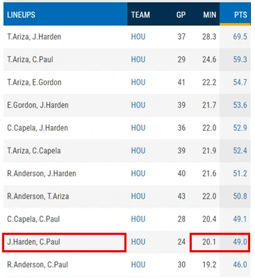 위 도표는 휴스턴 로켓츠의 선수들을 2명씩 조합해 보았을 때 그 둘이 함께 뛴 게임, 함께 뛴 시간, 함께 생산해 낸 득점을 정리한 것이다. 이 2인 라인업을 보았을 때 하든-폴 조합은 휴스턴의 모든 2인 라인업 중에 뛴 시간도 득점도 모두 정확히 10위에 랭크되어 있다. 득점을 시간으로 나눠보아도 하든-폴 조합은 팀 내 4위에 불과하다.