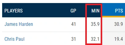 하든과 폴의 올 시즌 스탯 중 출장 시간을 다시 한 번 살펴보자.