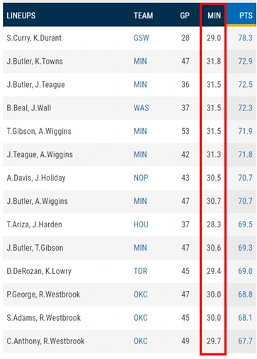 NBA 리그의 2인 라인업 중 최다 득점 상위 14조합의 평균 출장 시간은 30.4분이다. 이처럼 NBA 리그 전체를 놓고 보아도 위의 표를 보면 알 수 있듯 강력한 조합들은 상당 시간을 함께 뛰면서 더 많은 득점을 창출해 낸다.