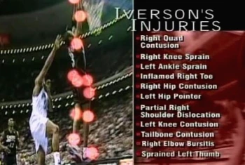 파이널 첫 게임. 아이버슨은 코비와 15cm, 샤크와 30cm 이상 신장 차이가 났고 각종 골절과 타박상 등 무려 11 군데의 부상을 이겨내고 1승을 먼저 따내는 기염을 토한다.