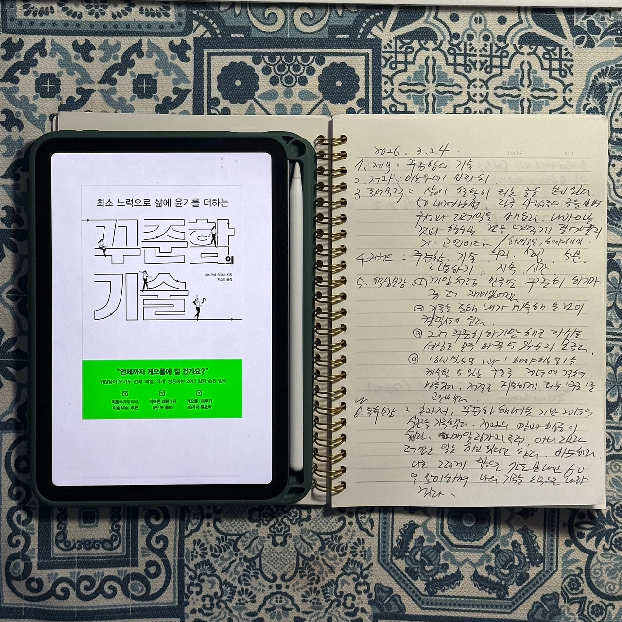 6. 독후소감 : 혼자서 꾸준히 해낸 지난 20년의 시간을 기록한 책이다. 작가의 말과 행동이 쉽다. 매일 26가지 루틴, 아니 더 많은 일을 하고 있다고 한다. ‘하고 싶은 일’과 ‘해야하는 일’을 모두 채워 하루를 꽉 차게 보내고 싶다. 앞으로 7년 그렇게 보내고 내가 60이 되는 날, 나도 그렇게 니의 기록을 책으로 만들어 보아야겠다. 그저 꾸준히 하기망 해도 되는 거니까.