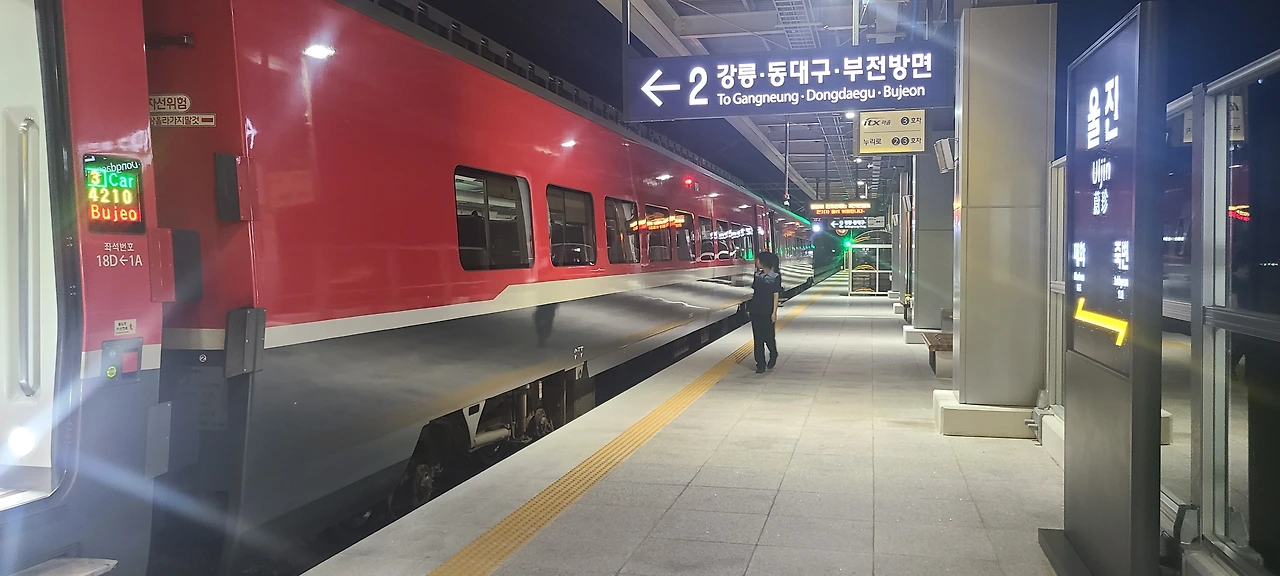 두 시간 가까이 걸려 울진역에 도착했습니다. 울진역에서 내리는 사람은 나 혼자였습니다. 캄캄한 역에 내려 기차가 출발하기를 기다렸습니다. 역무원 한 분이 기차를 보내고 돌아나옵니다. 아무도 없는 플랫폼에서 에스컬레이터를 타고 내려 역사 건물로 들어갔습니다. 새로 지은 건물이라 깨끗하게 관리되어 있었지만, 사람이 없으니 휑한 느낌이 들었습니다. 역사 건물 밖은 어두워서 어디가 어디인지 잘 구분이 되지 않아 조금 헤매다가 큰 길로 나오는 방향을 찾았습니다.