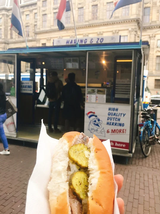 네덜란드의 음식에 대해 아는 사람은 많지 않다. 관광지에서 가 장 많이 보이는 것은 감자튀김 가게인데, 버거킹 감자튀김과 비슷 하게 두꺼운 감자튀김 위에, 마요네즈 같은 소스를 위에 뿌려 준 다. 양이 많아 간식이라기보다는 식사에 가깝다. 암스테르담은 관광객이 많은 도시답게 먹기 편한 피자, 파스타, 햄버거 가게가 즐 비하지만, 암스테르담은 애초에 청어를 중심으로 한자동맹의 주 요 항구도시로 해산물 유통이 활발했던 도시이다. 청어 절임을 뜻 하는 Haring이라는 단어를 검색해서 찾아간 노점 가게에서는 절인 청어 핫도그 와, 생선튀김을 팔았다. 절인 청 어 핫도그는 비리 지 않고 고소했으 며 바다 내음이 났다. 생선을 빵 에 끼워먹는 방식 이 너무나도 어색 하지만 빵과 피클 이 짠맛과 비린내 를 잡아줘서 색다 른 맛이 난다