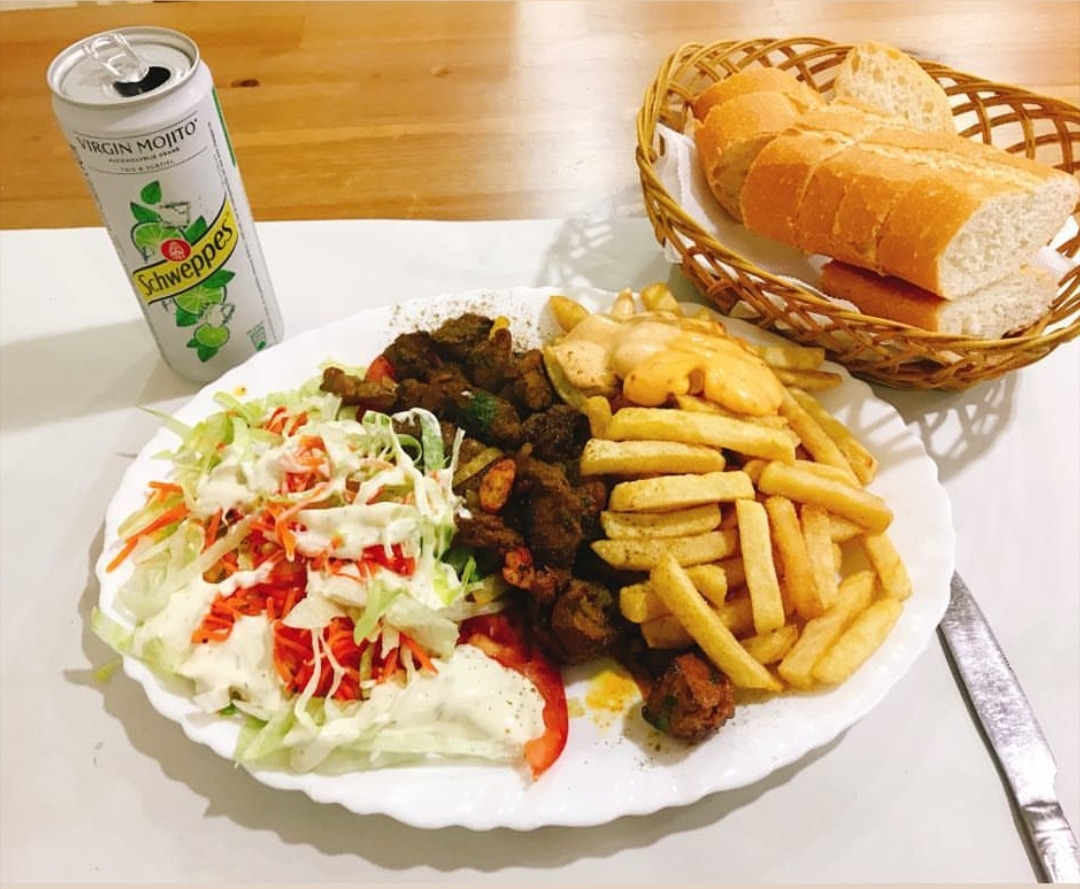 메뉴판을 봐도 영어가 아니어서 무슨 메뉴인지 짐작도 가질 않 았고 적당히 고기가 있을 것 같은 세트 메뉴를 주문했다. 그리고 나온 것이 향신료를 버무린 소고기구이 같은 것과 빵, 감자튀김, 샐러드의 알찬 메뉴였다. 돌아가는 고기를 칼로 썰어주고 흔한 케 밥의 이미지인 되너(Doner) 케밥과는 다른 종류의 케밥으로 추측 된다. 가격은 음료를 포함해 약 10유로 정도로 유럽 물가를 생각 하면 비싼 편은 아니다. 그렇게 음식이 나오고, 배가 너무 고파서 허겁지겁 먹어 없앴다. 과하게 친절해 보이는 주인이 어색하게 영 어로 맛 괜찮냐고 물어봤을 때, 나도 과하게 맛있다고 답했다. 맛 도 괜찮고 양도 많아서 상당히 배부르게 먹었다. 하지만 나는 이 음식의 이름을 아직도 모른다.