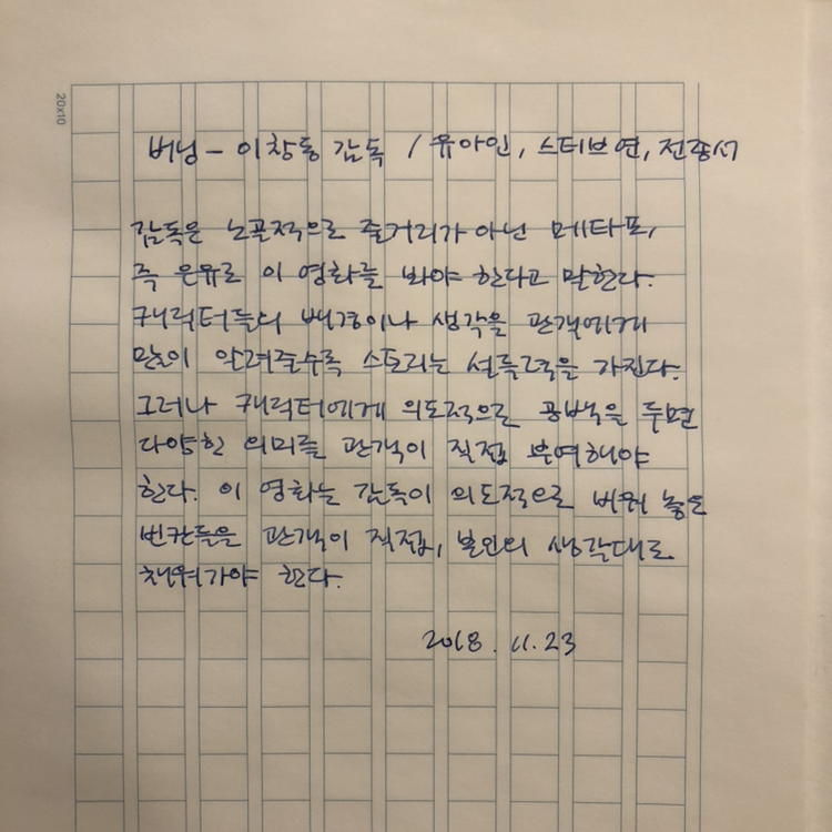 감독은 노골적으로 줄거리가 아닌 메타포, 은유로 이 영화를 봐야 한다고 말한다. 심지어 영화 안에서 해미는 벤에게 메타포가 뭔지 물어보고 벤은 종수에게 그 뜻을 설명해 달라고 한다. 캐릭터들의 배경이나 생각을 관객에게 많이 알려줄수록 스토리는 설득력을 가진다. 그러나 캐릭터에 의도적으로 공백을 두면 다양한 의미를 관객이 직접 부여해야 한다. 이 영화는 감독이 의도적으로 비워 놓은 빈칸들을 관객이 직접, 본인의 생각대로 채워가야 한다. 하지만 스토리에 설득력이 떨어진다는 느낌을 없앨 수 없다. 감독의 메시지를 조금 더 드러냈으면 더 보기 수월한 영화가 되지 않았을까. 이창동 감독이기 때문에 한번 생각하고 넘길 것을 두세번 생각하게 된다. ‘이창동 감독이기 때문에' 새로운 해석들을 기다리게 된다.