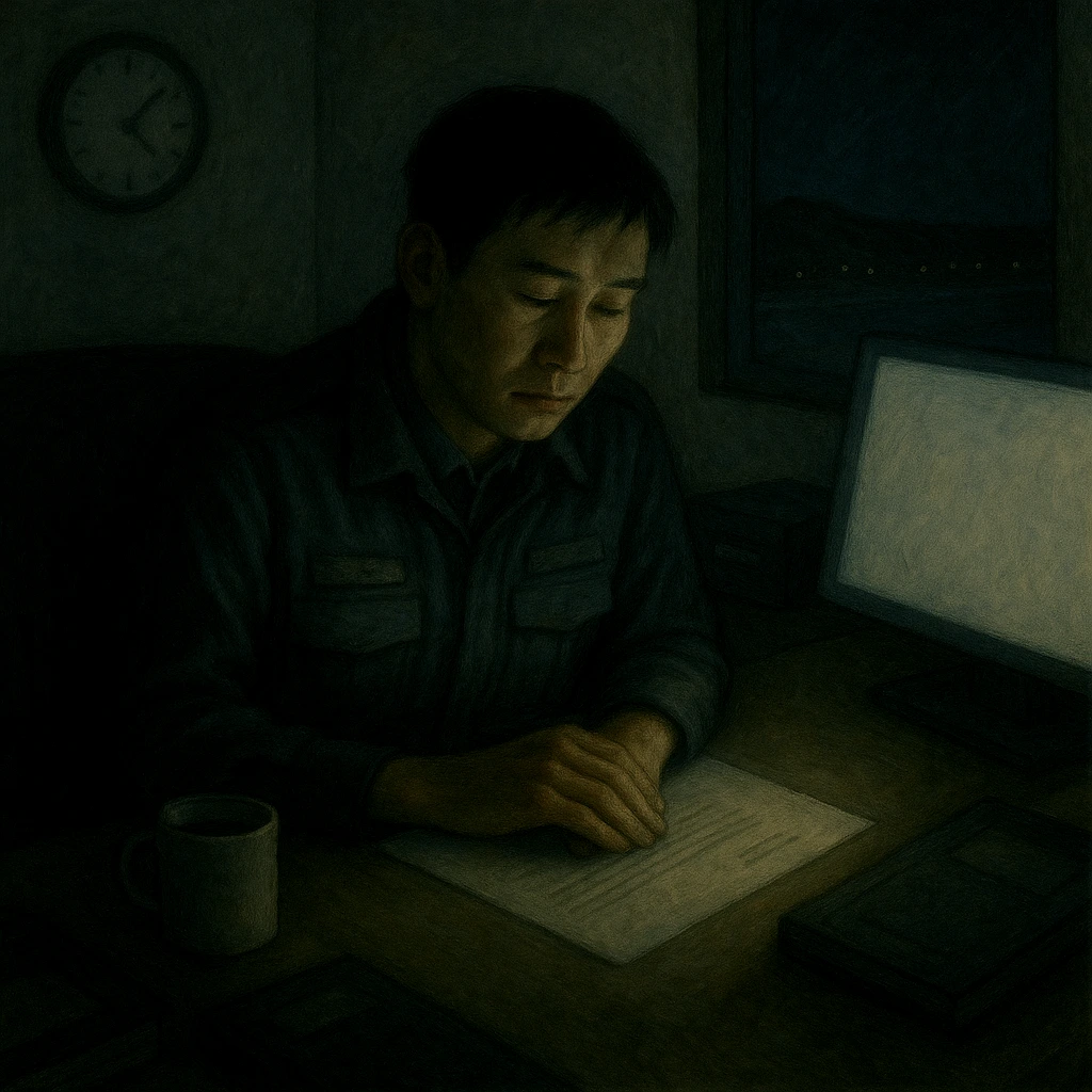 그날 밤, 나는 불 꺼진 사무실에 남았다. 모니터 불빛 아래서 숨을 골랐다. 몇 번의 한숨이 흘러나왔다. 하얀 종이엔 딱딱한 글자가 담겼다. 이 사건의 사실관계는 가만 아무말도 하지 않았다. 비릿한 쇳내가 나는 듯 했다. 여러 단어를 썻다 지우기를 반복했다. 키보드 소리, 시계바늘 소리가 사무실을 채웠다. 내 호흡이 점점 바닥부터 쌓여가듯이, 텅 빈 사무실이 허연 무언가로 채워져갔다. 나는 내일을 떠올렸다. 내일도 하늘은 파랗게 열릴 것이었다. 아무 일도 없다는 듯이.