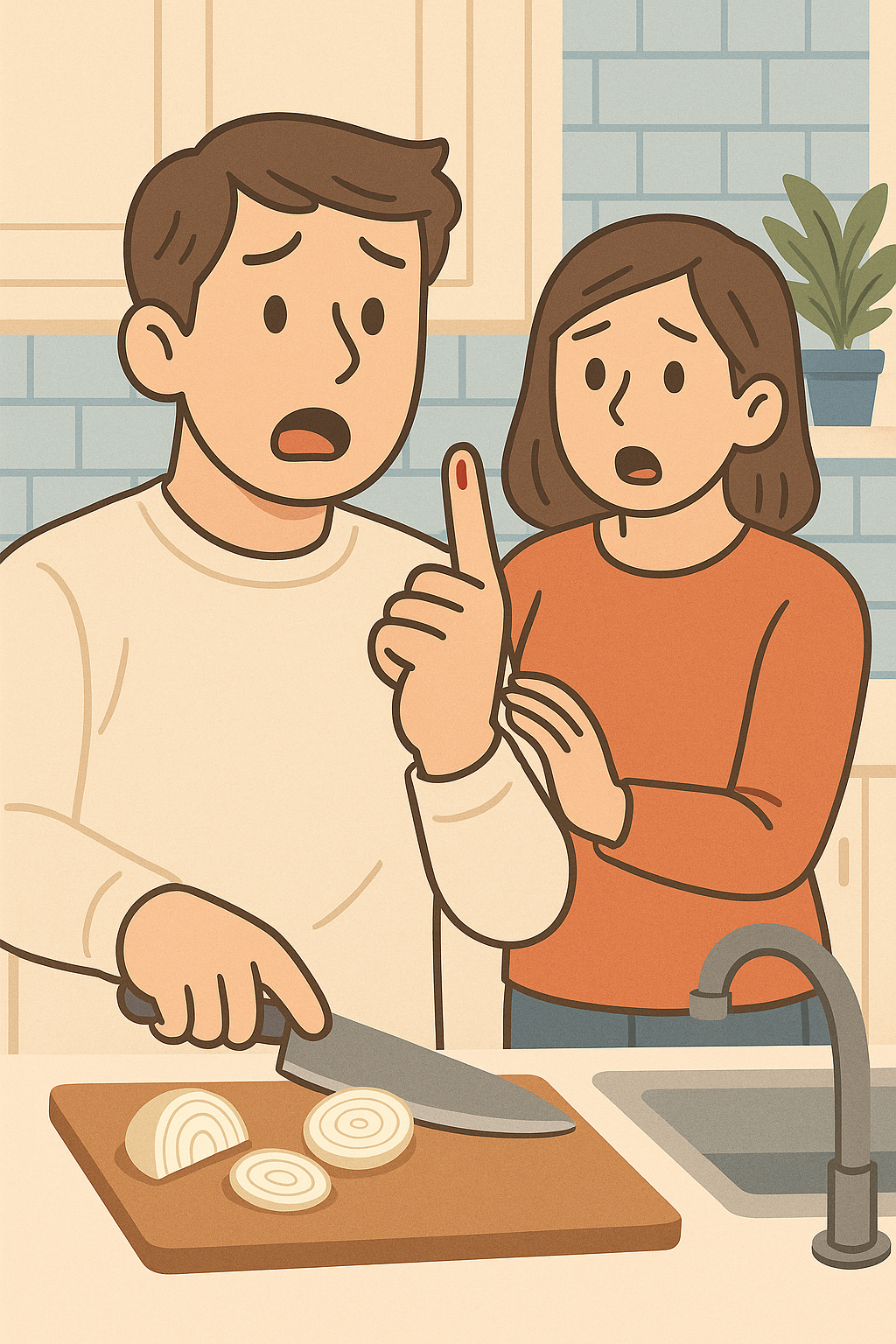나는 오늘 해주고 싶은 일들이 꽤나 많았기 때문에 저녁상 차리기 과제도 얼른 끝내고 싶기라도 했는지, 잘하지도 못하는 칼질을 거침없이 퍽 용감하게 이어갔다. 그런데 이게 화근이었다. 이제 막 김치찌개를 만들기 위한 초기 단계였던 양파를 썰던 도중 손가락을 베여버린 것이다. 사실 조금 베인 정도가 아니라 거의 손가락 끝부분을 잘라버렸다고도 할 수 있을 정도로 사고를 쳤다.