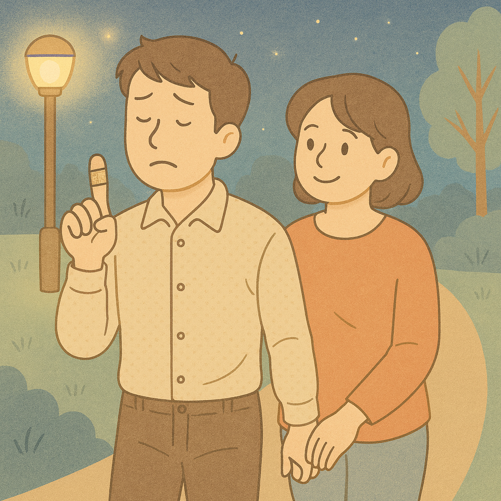 우린 늦은 밤이 되기 전, 같이 손을 잡고 산책에 나섰다. 내 손가락 끝엔 대일밴드가 붙여져 있었고 슬리퍼를 질질 끄는 두 발에는 술기운에 묻어있어서 보이지 않는 미세한 떨림을 동반했다. 정신도 딱 절반만 깬 상태였지만 그래도 우리는 소박한 담소를 나누면서 공원을 끝끝내 한 바퀴 모두 돌고 나서 집으로 돌아왔다. 그리고 나는 아마도 산책을 끝마친 뒤 집에 돌아와서 곧바로 다시 잠에 빠졌다. 그래도 밴드가 붙여져 있던 손바닥에는 아내의 손에서 전해져온 체온이 선명하게 남았다.