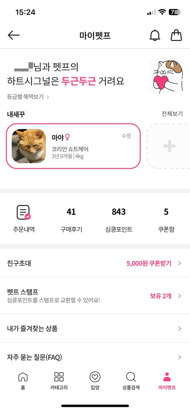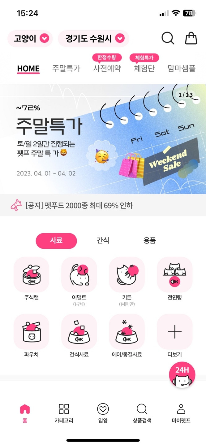마이페이지에서 반려동물을 등록하게 해 개인화를 제공하고 있다. 우리나라의 경우 '강아지(사실 옳은 표현은 '개'다)' 양육가구가 더 많아, 고양이를 키우는 사용자는 매번 필터를 변경하기 일쑤다. 이런 과정을 통해 유저들이 더 빠르게 관련 상품에 접근할 수 있게 했다.
