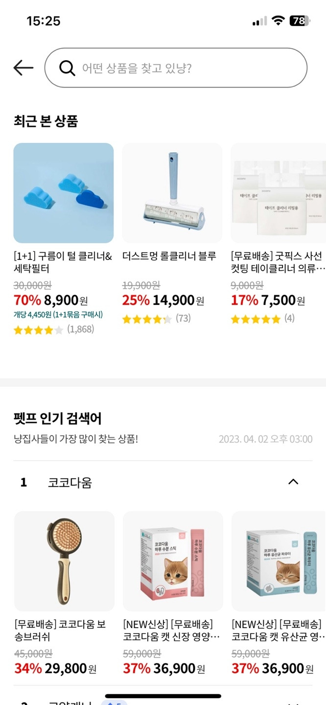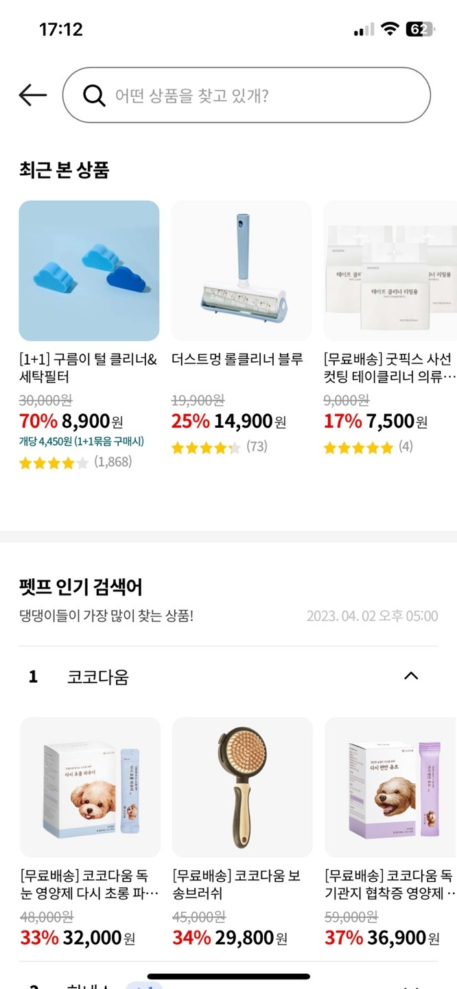 반려동물 서비스답게 반려동물과 관련된 UX writing이 인상적이다. 고양이의 경우 '어떤 상품을 찾고 있냥?'이라고 나타나고 '강아지의 경우 '어떤 상품을 찾고 있개?'라고 검색창의 힌트를 보여주고 있다.