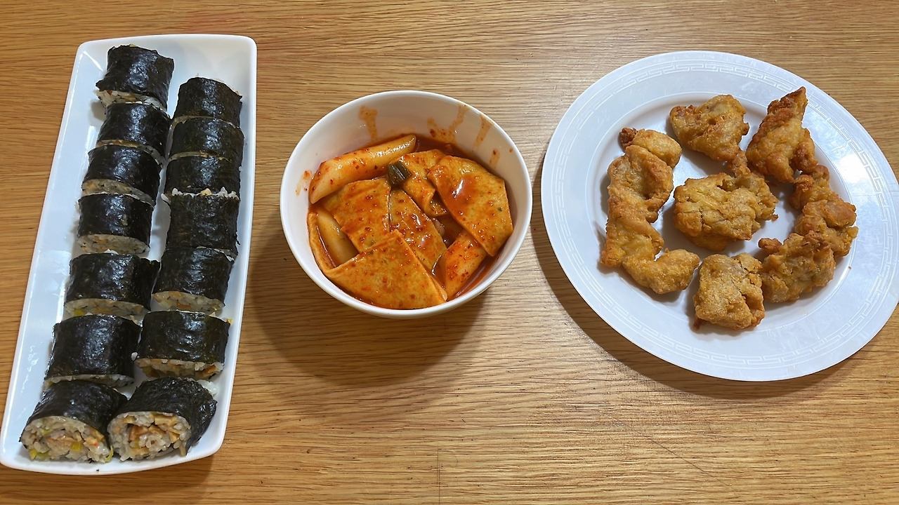 어묵 야채 김밥, 떡볶이, 치킨 가라아게