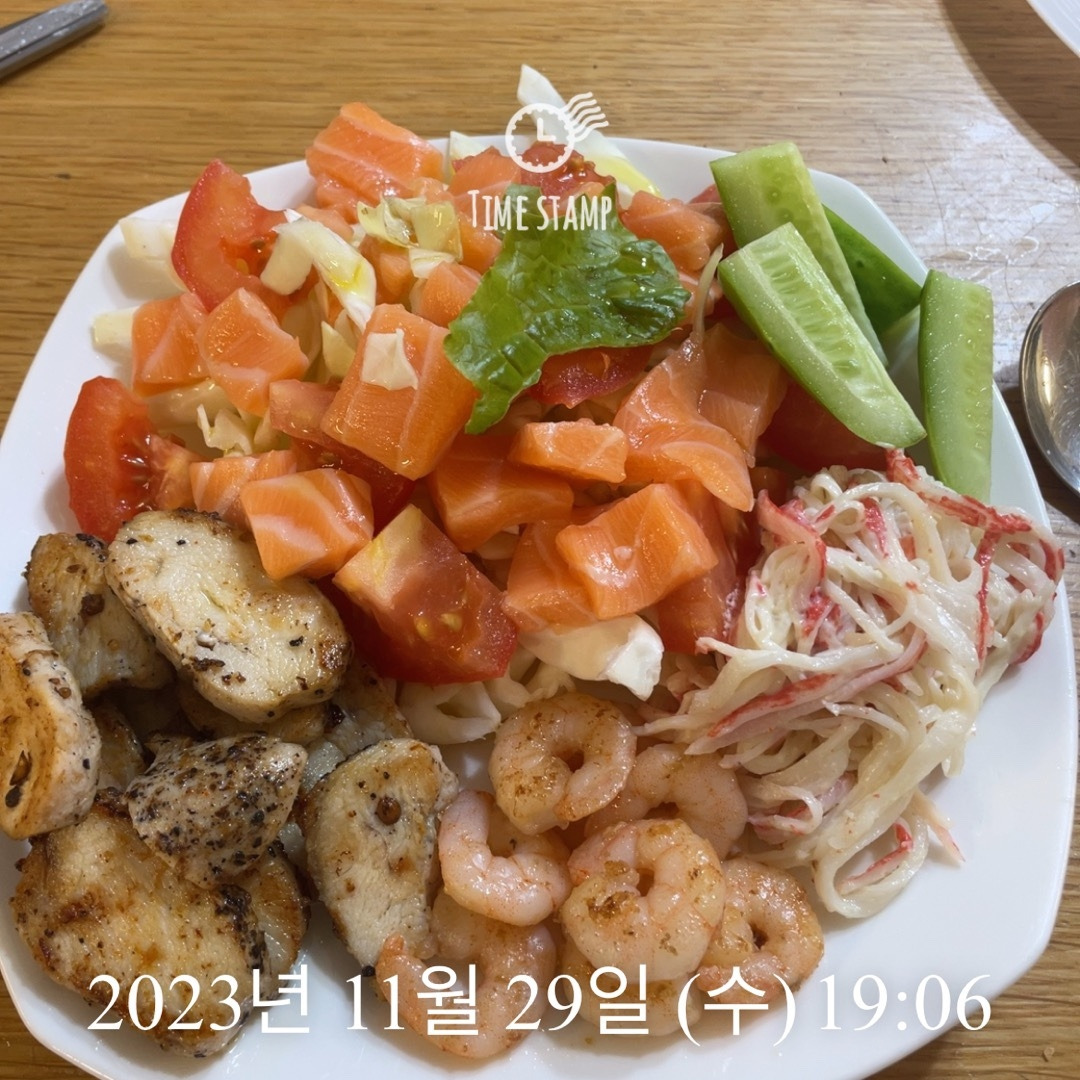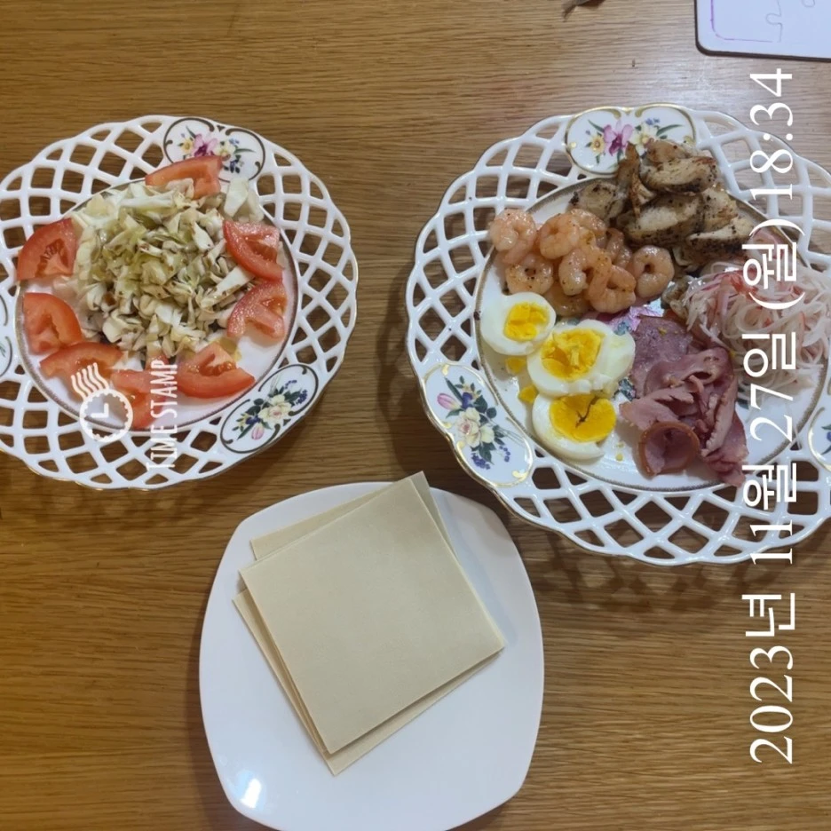 아무튼 다시 돌아와서 포두부에 저렇게 다양한 새우, 닭가슴살, 삶은 계란, 베이컨 등을 싸서 먹으니 약간 입이 텁텁, 두부 특유의 목메임이 느껴졌지만 먹을 만했다. 심지어 소스도 안넣고 먹어서 무당, 무탄수는 저절로... 그래서 토마토와 양배추를 곁들여서 샐러드로 먹으니 먹을만했다.