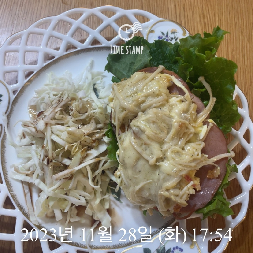 그리고 나서 몸무게를 쟀는데 웬걸, 어제보다 0.5kg 증량됐다. 마침 화장실을 못갔기 때문에 그런거라고 생각했다. 그리고 샌드위치를 먹고 싶었기 때문에 저탄수화물 빵을 반으로 컷팅했다. 반으로 가르면 탄수화물이 13g 정도 된다. 그래서 야채 가득, 크래미 마요(아보카도 마요네즈 사용으로 탄수, 당이 제로다), 베이컨에 팽이버섯에 모짜렐라 치즈를 올려 올렸다. 중간에 계란후라이와 스리라차 소스도 필수! 그냥 먹으면 느끼하니까 샐러드도 곁들였다. 크래미에 탄수화물이 들어있기는 하지만 이것도 4g 정도라 한끼에 30g 정도의 탄수화물은 괜찮다고 한다. (feat 챌린지 코치님 피셜) 그리고 너무 탄수화물을 제한하면 정말 배고프다. 그러다보면 입터짐을 주체할 수 없을지도... 여기에 어제 사온 닭죽을 1/4만 먹었다. 더 먹고 싶었는데 참느라 혼났다는....