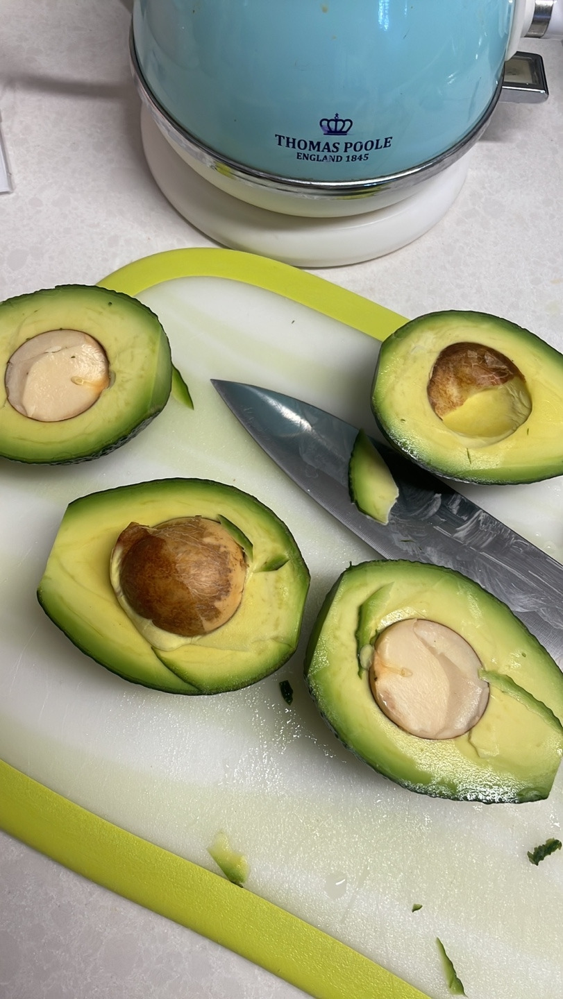1 아보카도에 칼집을 내서 반으로 가른다. 나는 이 과정이 굉장히 어려웠다. 유투브에 아보카도 까는 법이 나와있으니 영상을 꼭 보고 자르시길 바란다. 아니면 나처럼.. 아보카도가 저렇게 산산조각이 난다. 후숙된 걸 하는 걸 추천하나 나는 실험정신이 앞서서 후숙되지 않은 아보카도를 쪼개느라 훨씬 더 힘이 들었다. 칼집을 내고 시계방향으로 돌리면 아보카도 씨앗이 나온다고 하는데 글쎄.. 나는 힘으로 댕강... 반으로 씨앗까지 쪼개버렸다. (부끄... ㅋㅋㅋㅋㅋㅋㅋ)