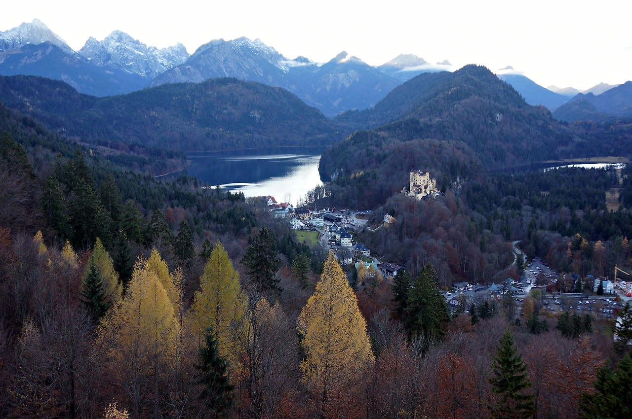 노인슈반슈타인 성에서 내려다본 풍경. 오른쪽으로 호엔슈방가우 성이 보인다.
