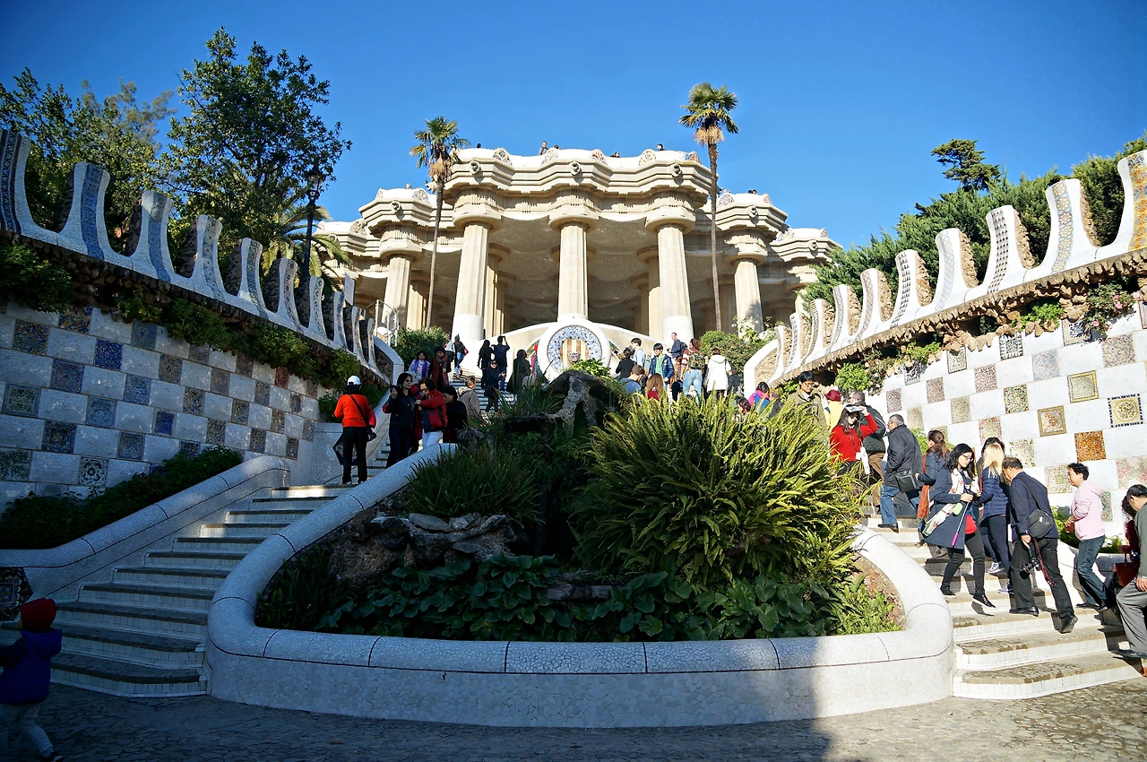 구엘 공원 전경. 사진 뒤편에 기둥이 떠받치고 있는 것이 ‘자연의 광장’이다. 광장 바닥엔 고운 모래가 깔려 있다.