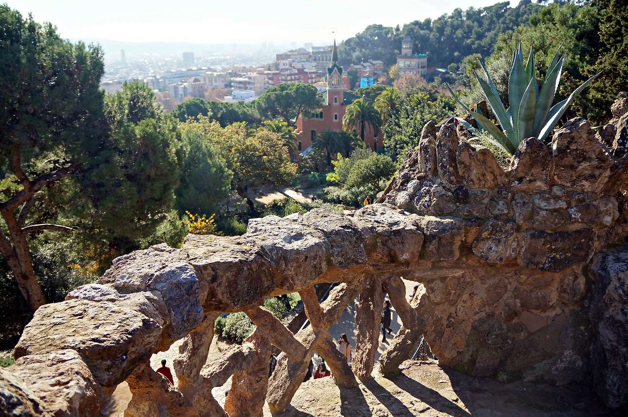 구엘 공원을 돌아다니다보면 이처럼 용설란(龍舌蘭)이 심어진 길이나 난간을 자주 만나게 된다. 용설란의 뿌리는 흙을 단단하게 잡아주는 역할을 한다. 이 때문에 가우디는 용설란을 매우 좋아했고, 사진에서처럼 기둥 등의 상단 부분에 심어 건축물의 안정성을 제고했다고 한다. 난간엔 듬성듬성 구멍이 뚫려 있다. 거센 바람이 불어도 무너지지 않게 하기 위해서다.