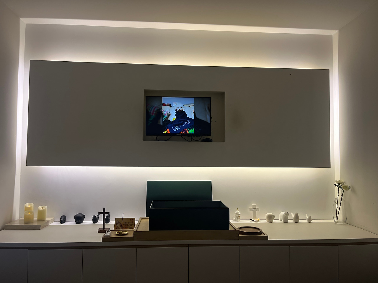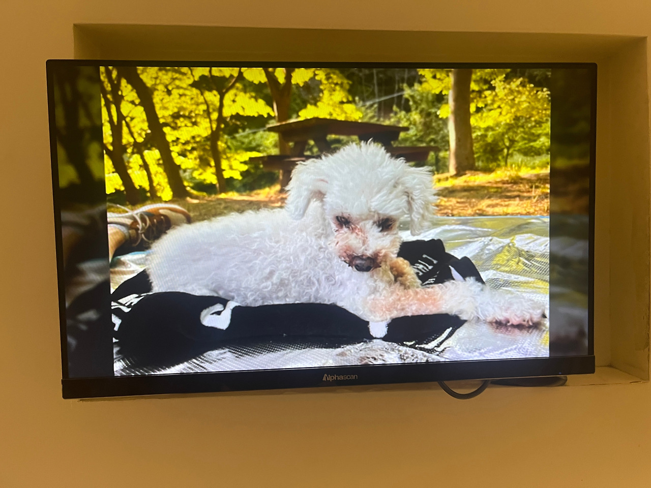 건물 분위기가 자뭇 엄숙하다. 건물 색상부터 검은색이고, 기다리고 있는 몇 직원분의 옷도 모두 검은색이다. 그렇지, 이곳은 반려견을 위한 장례식장에 온 것이다. 장례식장 안으로 안내를 받아 들어간 방에 벌써 재롱이 사진이 스크린을 통해 나왔다. 재롱이와 함께 지난 시간을 기억하기 위해 핸드폰에 있는 몇 개의 사진을 미리 장례회사 앱을 통해 보낸 것이다. 이사진에는 이때만 하더라도 백내장이 심하지 않아서 눈이 귀엽고 씩씩한 모습이다.