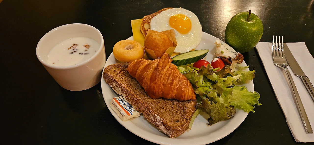 아침은 오늘도 호텔뷔페식으로 먹었는데 어제 독일 호텔보다 수준이 높아 다양하게 잘 먹었다. 특히 방금 구운 따듯한 빵을 처음으로 커팅해서 먹는 재미가 있었다.