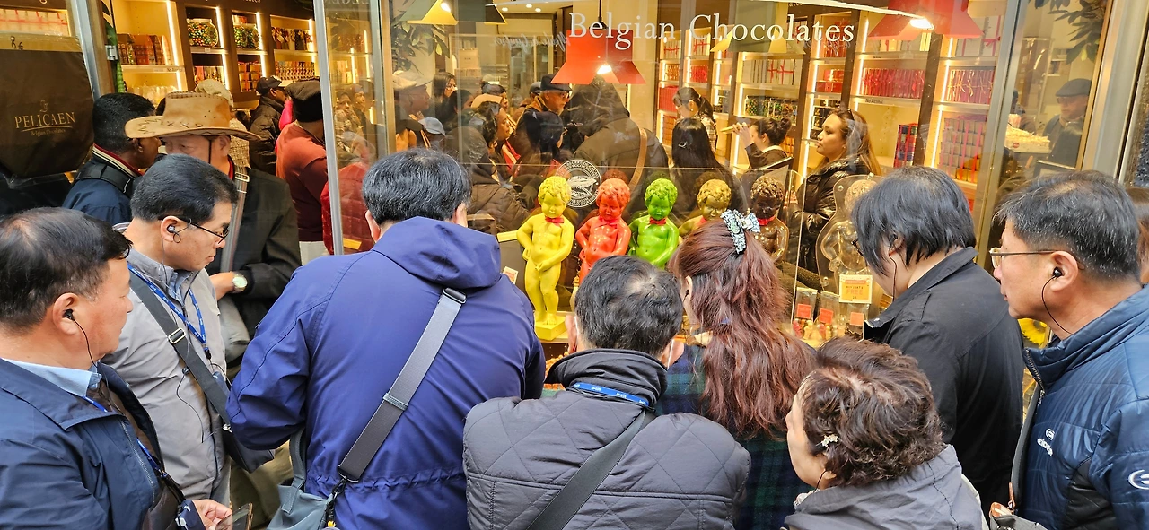 광장에서 동상까지 가는 길에 초콜릿 가게와 와플가게가