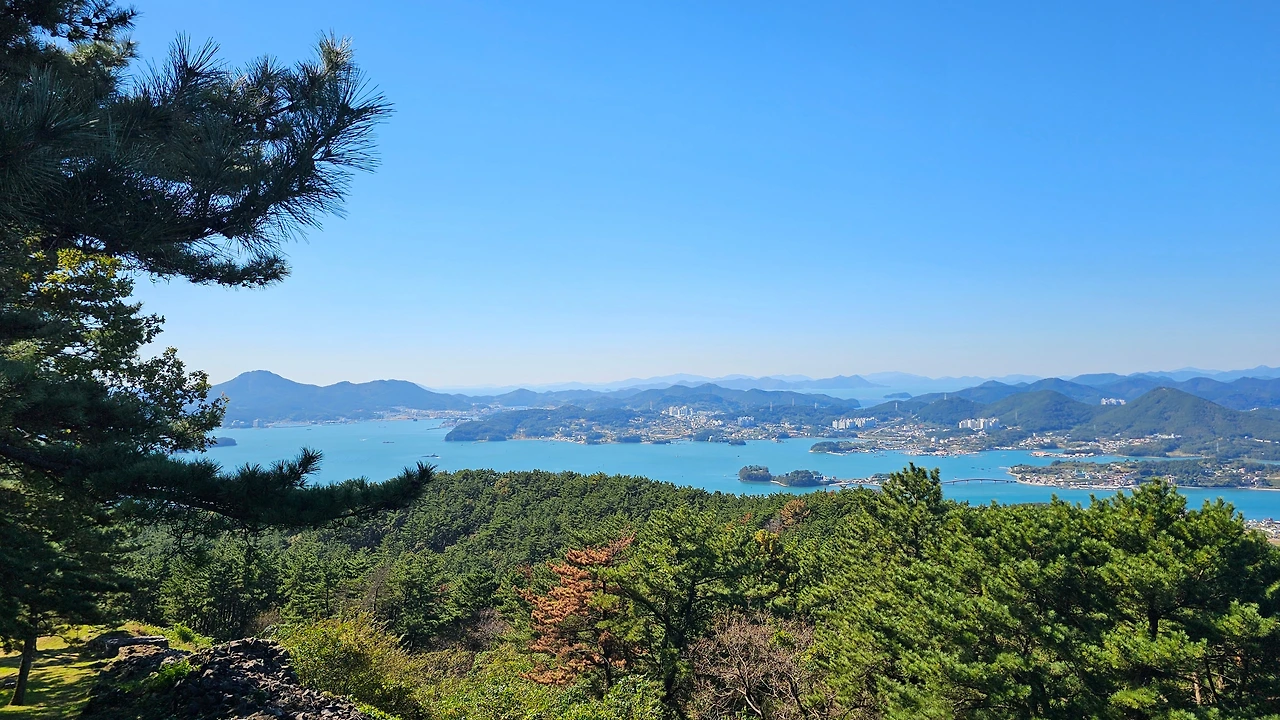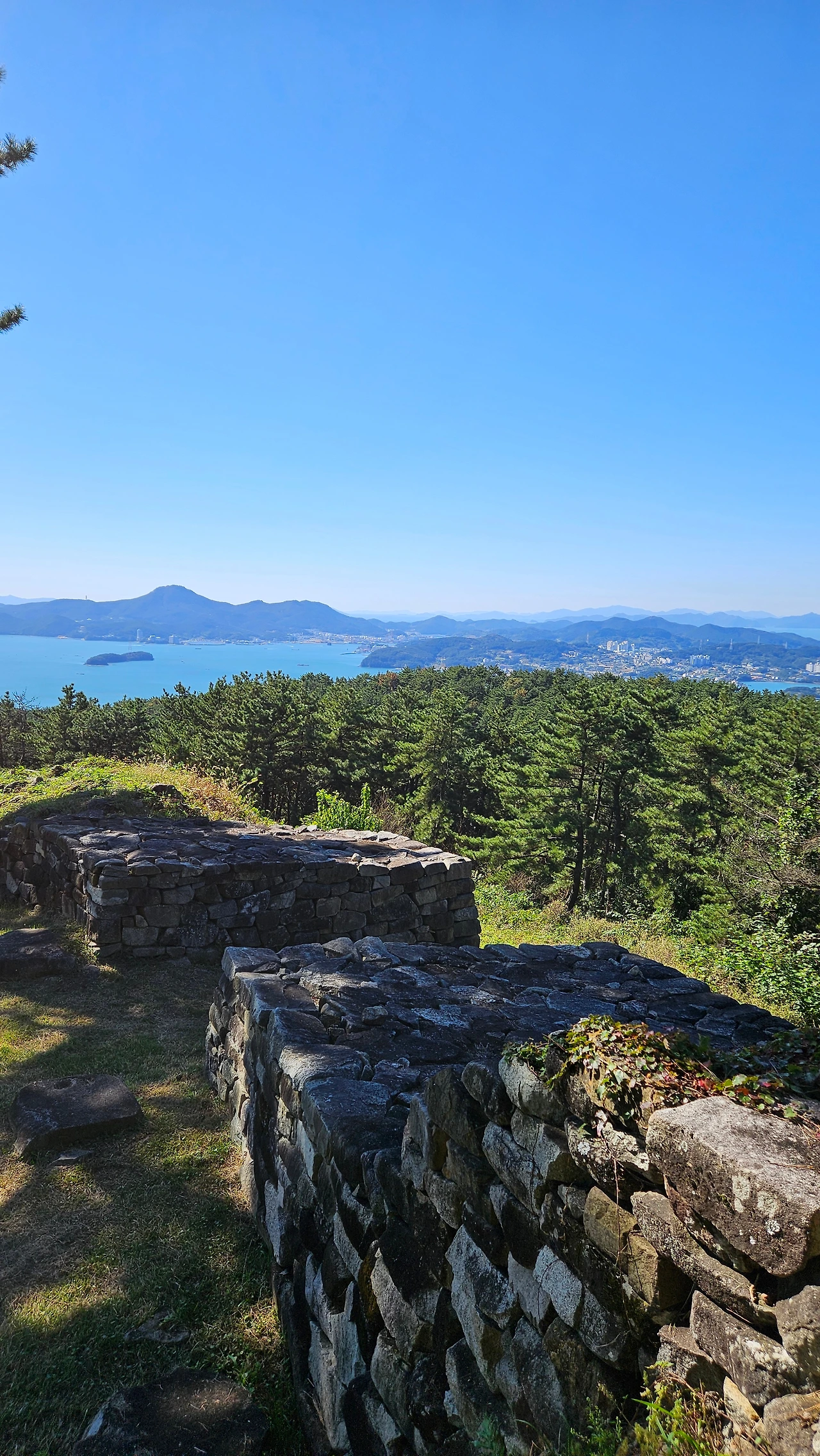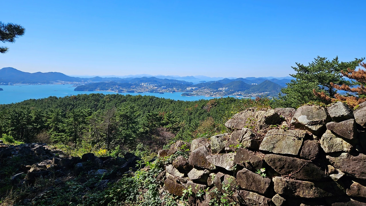 둔덕기성에 올라가는 동안 소나무 군락과 규모가 큰 성곽에 놀랐고 서문지 쪽에서 보이는 통영이 너무 가깝게 보이는 풍경에 또 한 번 놀랐다. 그동안 거제에서 올라간 성 중 최고였다.