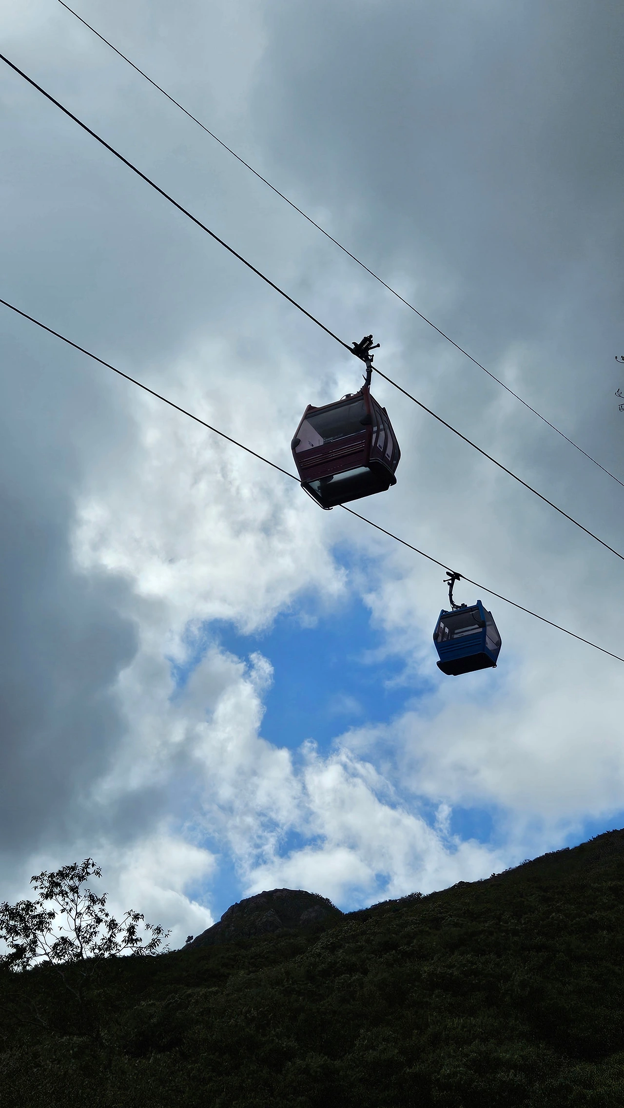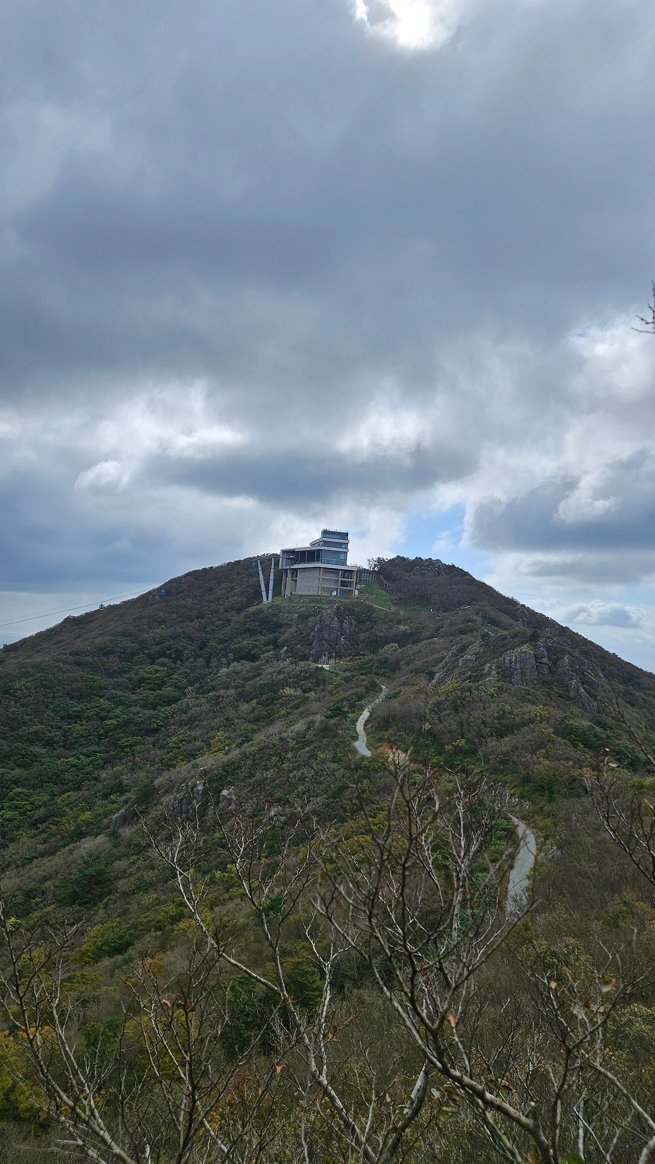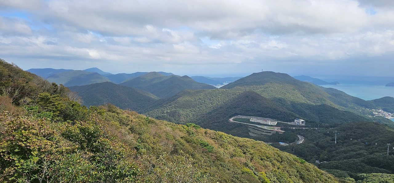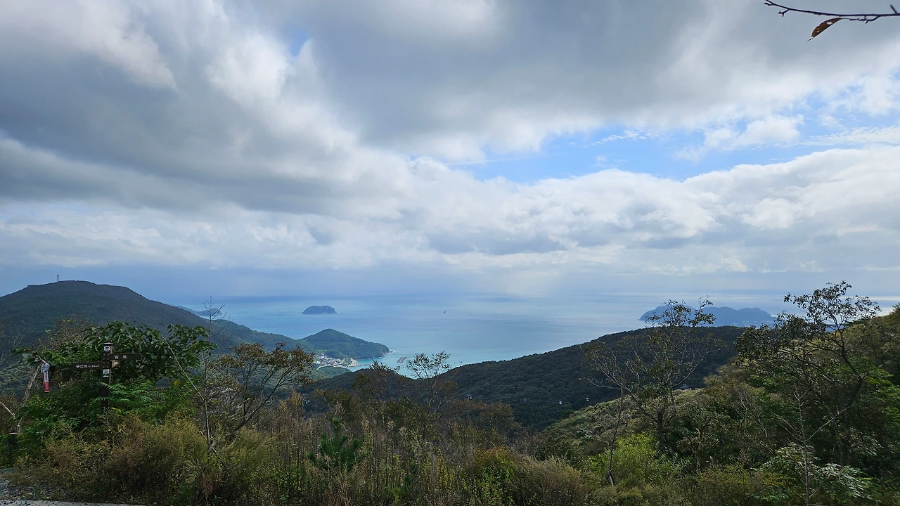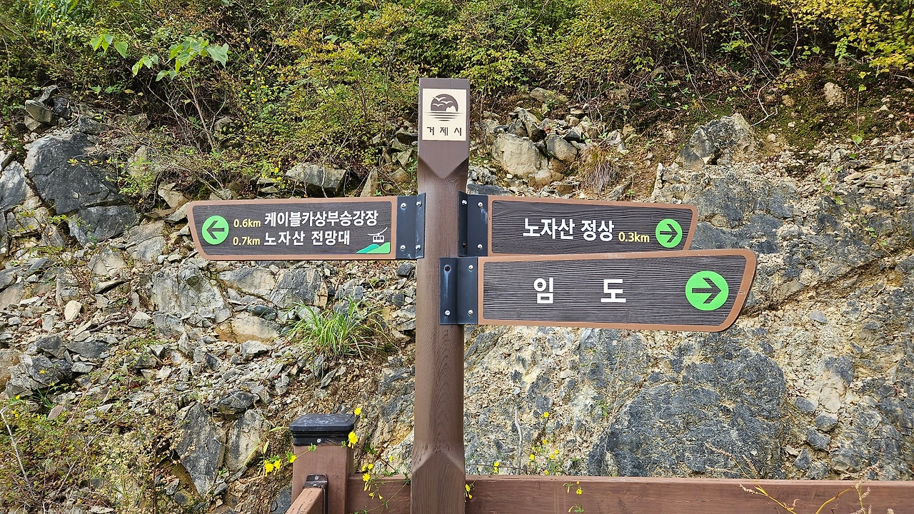 생각보다 등산로가 가팔라서 어제 보다 땀을 더 흘리며 힘들게 올라갔다. 40분 정도 올라가 임도를 만나는 4거리에 들어서니 학동고개에서 노자산 정상으로 다니는 '거제 파노라마 케이블카'가 보이기 시작했다.