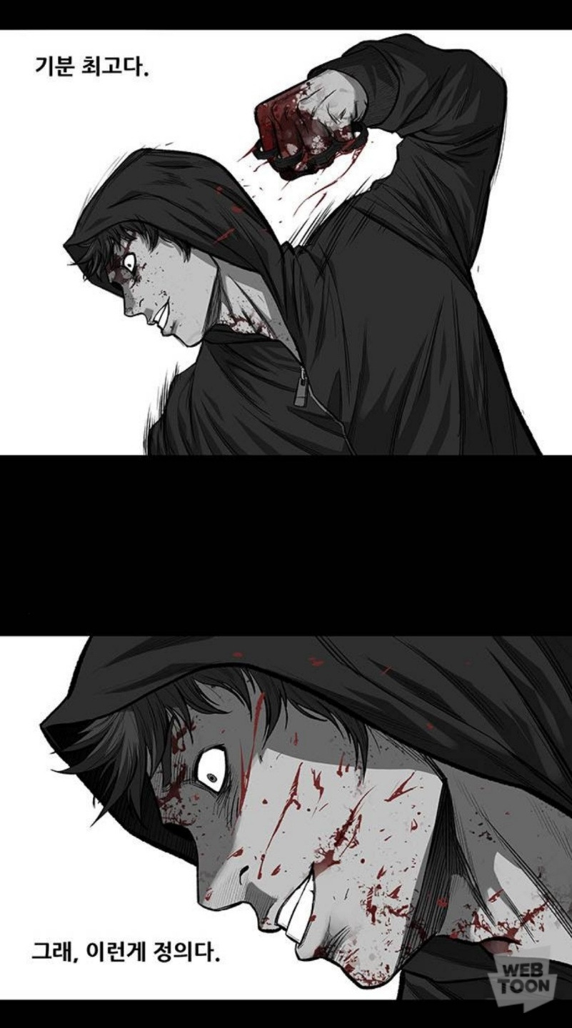 김지용은 어린 시절 어머니가 아무런 이유없이 폭행당하는 것을 지켜봐야만 했습니다. 자신은 어렸기에 아무것도 할 수 없었고 그때 느꼈던 무기력감을 평생동안 마음 속에 간직하고 삽니다. 이후 경찰대에 진학하게 된 김지용은 법으로 심판할 수 없는 범죄자들을 자신이 직접 폭력으로 처단하기 시작합니다. 사회의 거악을 처단하고 자신이 잡혀들어러감으로써 현 법 체계의 모순점을 지적하겠다는 것이 김지용의 목표였는데요. 자기 자신을 파괴해가면서까지 범죄자들에게 복수를 하려는 그가 안쓰럽기도 하면서도, 과거에 느꼈던 상처가 얼마나 그에게 깊은 영향을 주고 있는지를 스토리 진행과정에서 반복적으로 느낄 수 있었습니다.