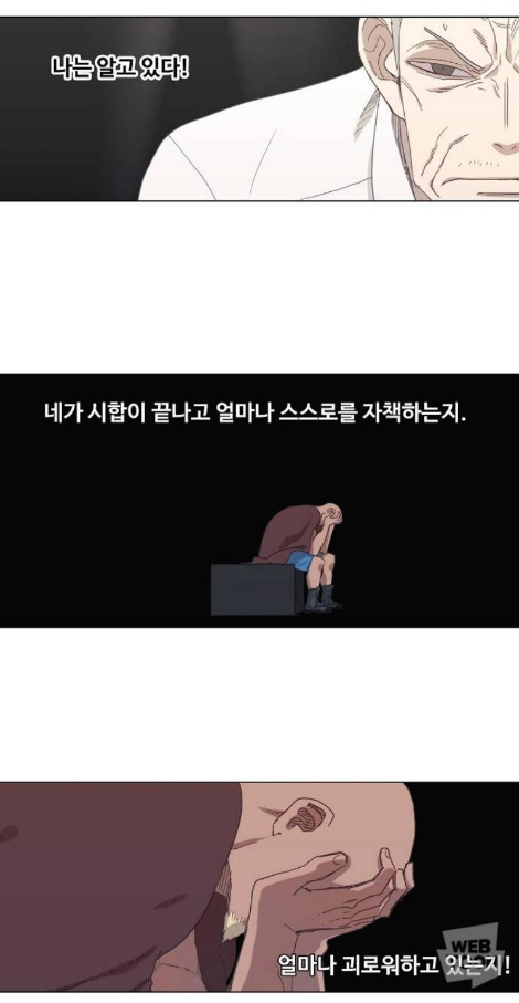 다른 웹툰을 살펴볼까요, 네이버 목요 웹툰 더 복서에는 존 테이커라는 인물이 있습니다. 주인공 유의 데뷔전 상대인데, 반칙을 일삼는 비겁한 복서로 그려집니다. 하지만 이 테이커에게도 사정은 있었죠, 원래 뒷골목에서 암울한 생활을 이어나가던 테이커는 나이 든 백발 남자 코치의 제안으로 우연한 계기로 복싱을 시작하게 됩니다. 하지만 테이커는 재능이 없었고, 그저 엘리트 선수들의 데뷔용 샌드백 선수의 역할만 하게 됩니다. 그러다 한 경기에서 실수로 반칙을 써서 상대를 이기게 되는데, 협회에서도 그것을 용인해주게 됩니다. 협회에서 필요한 건 그런 돌발성 캐릭터였던 것이죠. 앞으로도 그렇게 더티 플레이를 하는 조건으로 경기 출전의 기회를 얻은 테이커는 이 기회를 놓치지 않고 잡게 됩니다.