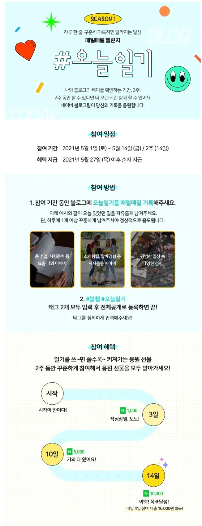 쉽게 이야기하면 2주 동안 자신의 블로그에 일기를 쓰면 16,000원 네이버 페이를 준다는 이벤트였다.
