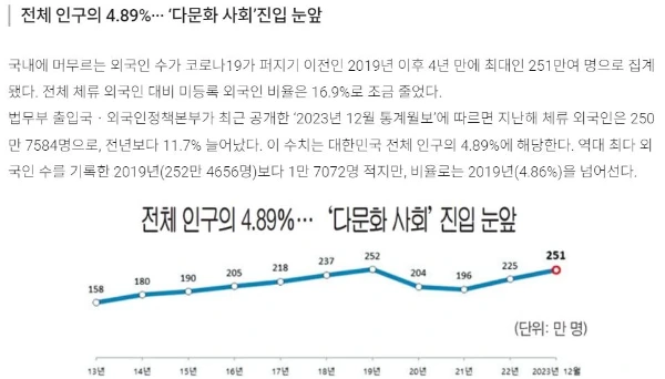 "국내 체류 외국인 250만 명 넘었다" (출처 : 소년한국일보)