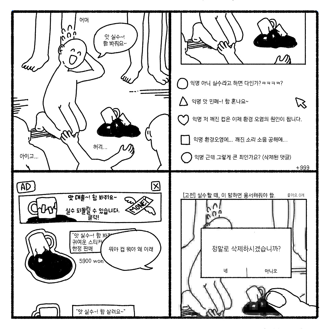 2화 '용서'는 인터넷에서 유행하는 '짤'의 형태를 보여주기 위한 4컷만화입니다.