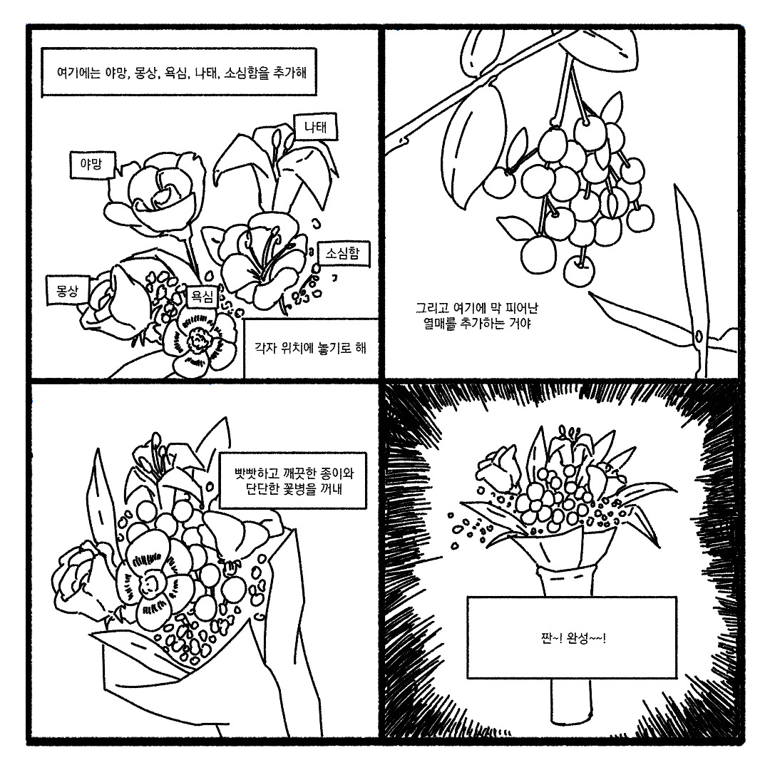 저도 저의 단점들이 큰 꽃다발 안에 있는 작은 들꽃이라고 생각하며 마냥 미워하지 않기 위해 노력하겠습니다!